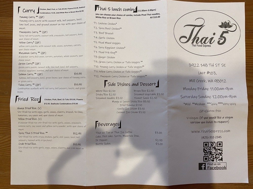Welcome to Thai 5, Thai Food Express, a gem located at 3922 148th St SE #103, Mill Creek, WA. Here, authenticity shines through a carefully crafted menu, offering a delightful array of soups, salads, and desserts. Customers rave about the Panang Curry, once hailed as the best in the world, transporting them straight to the streets of Bangkok with each bite.